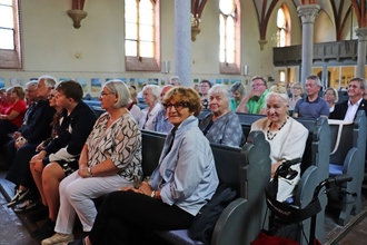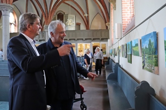 Alle Bilder haben wir am letzten Tag nun schon traditionsgemäß in der Evangelischen Kirche in Heinersbrück an die Wände gehängt und mit einer sehr schönen Vernissage die Ausstellung eröffnet. Dazu trug besonders der 11jährige Kiron Nattke bei, der uns und die zahlreichen Besucher mit wundervoller Musik am Keybord verzauberte. Besonders begrüßten wir die Leiterin der Abteilung Kultur aus der Partnergemeinde Swidnica, Pani Dagmara Ostrowska, den Amtsdirektor des Amtes Peitz, Norbert Krüger und die Vorsitzende des Gemeindekirchenrates, Christine Adam. Unser Amtsdirektor betonte in seiner Grußrede, dass er es sehr anerkennenswert findet, wie unsere beiden Malgruppen die Partnerschaft zwischen den beiden Gemeinden über so viele Jahre aufrechterhalten und belebt haben. Das zeige, wie es gelingen kann, Freundschaft und Zusammenhalt im Kleinen zu bewahren. Er war erstaunt, dass so viele Bilder, die die Schönheit unserer Region zeigen, in der kurzen Zeit entstanden sind.