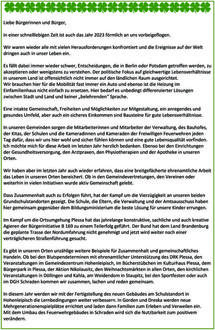 Wir haben aber im letzten Jahr auch wieder erfahren, dass eine breitgefächerte ehrenamtliche Arbeit das Leben in unseren Orten bereichert. Ob in den Gemeindevertretungen, den Vereinen oder weiterhin in vielen Initiativen wurde aktiv Gemeinschaft gelebt.