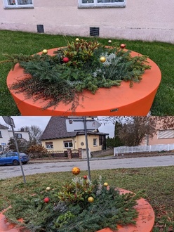Die Frauen waren ebenfalls am Donnerstag zum Schmücken erschienen. In Gruppen aufgeteilt, ging es ans Werk. Angefangen im Keller, dort wurden am Eingang die Scheiben mit weihnachtlichen Motiven gestaltet. Der Pavillon sowie die Hochbeete wurden festlich dekoriert. Aber auch die Blumenschalen des Ortes von Anke und Bianca geschmückt.