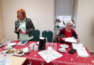 Dank der vielfältigen Angebote und abwechslungsreichen Kurse können „wir die Krankheiten mal vergessen“, betont Carla in ihrer Ansprache. Frau Lassig sorgt für gut Laune, indem sie Helene Fischer mimt, Mandy töpfert Medaillen für die Senioren, Bastelkurse fördern die motorischen Fingerfertigkeiten. Dank Ursel gibt es aktuell acht aktive Näherinnen im Gemeindezentrum. Gemeinsam entwerfen sie Wimpelketten für die Grundschule und das Herbstfest. Aus Stoffspenden werden Tischdecken genäht.