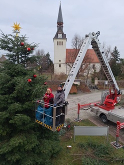 Jedes Jahr zur selben Zeit so mitten im Sommer schauen wir schon mal nach einer passenden Tanne. In diesem Jahr war Christine ein wunderschöner Baum beim Spaziergang ins Blickfeld geraten. Gefragt und getan. Der Bürgermeister und Carla fanden ihn gut. Der Sponsor Klaus Bialecki aus Hohenleipisch. Nach Absprache, was wie immer mit dem Bürgermeister erfolgte, wurde der Baum vom Bauhof gefällt und transportiert von der Firma Hentschel. Danke dafür. Nun stand er da und wartet auf seinen Schmuck. Im Vorfeld wurden dafür die Kugeln von den Frauen des Gemeindezentrums gesäubert, sortiert und repariert. Ebenso die Lichterketten geprüft. Dann endlich Enrico Schmidt von der Dachdeckerfirma Angelika Schmidt fuhr mit der Hebebühne vor.
