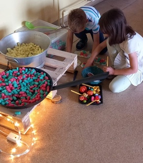 Nicht nur für Kinder ist diese Zeit spannend. Auch für uns Erzieher war es eine herausfordernde Zeit. Denn auch wir haben uns neu erfunden. So entstand mit Lichterkette und Pfanne ein Lagerfeuer auf einer Palette. Zapfen und Kastanien dienten als symbolisierte Lebensmittel.