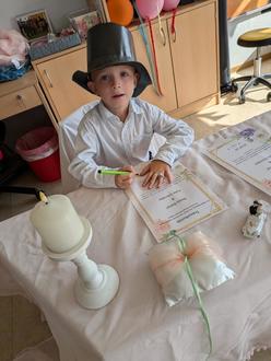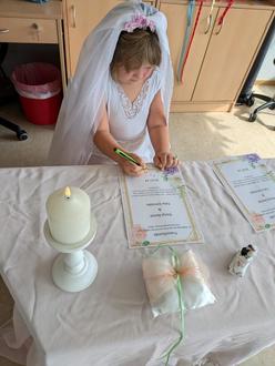 Der Erzieher nahm die Kinder beim Wort, ging die Sache ganz realistisch und zur Freude der Kinder mit reichlich Requisiten an. So wurden neben der gesamten Gruppe als Hochzeitsgäste auch die Eltern involviert. Selbstverständlich mussten diese ihr Einverständnis geben und gleichzeitig auch für die geeignete Garderobe sorgen.