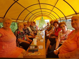 Am Weidendom angekommen, gab es Kaffee und Kuchen. Zudem wurden wir mit einem freundlichen „IAH“ von den Eseln auf der Weide nebenan begrüßt. Es war ein schöner Spätsommernachmittag. Die Seniorinnen und Senioren genossen die Fahrt.