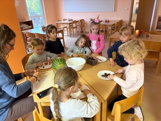 Mit den Kindern wurden die verschiedenen Dinge mit allen Sinnen erforscht. Während in der kleinsten Krippengruppe die Kinder der Handpuppe „Oma Elfriede“ beim aufsammeln der Äpfel (Bälle) halfen und einen Blätterlöwen gestalteten, wurde bei den Älteren leckerer Apfelkuchen und Apfelkekse gebacken und eine Gemüsesuppe gekocht.
