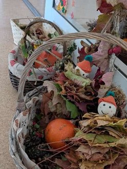 … klingt es in diesen Tagen durch die Räume der KITA Storchennest. Die Eltern haben mit ihren Kindern verschiedene Herbstsachen, wie Hagebutten, Kastanien, Eicheln, Nüsse, bunte Blätter, Äpfel, Zierkürbisse und vieles mehr gesammelt und in liebevoll gestalteten Körbchen mitgebracht. Vielen Dank dafür.