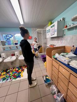 Im Obergeschoss wurde der Bewegungsraum neugestaltet, Schränke ab- und aufgebaut. Arbeitsmaterialien, die für den Sport benötigt werden, sind jetzt schneller hin- und weggeräumt, das Sportangebot kann effektiver gestaltet werden.