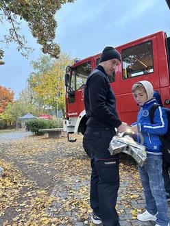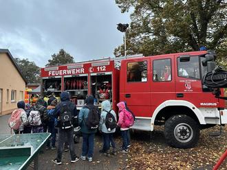 Neugierige Kinder entdecken das Löschfahrzeug und erfahren, wie die Feuerwehr im Einsatz hilft.