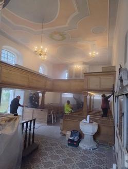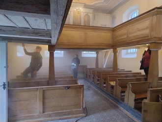 Das Problem ist der alte Anstrich unter der Empore. Dieser bröckelte und fiel uns und unseren Gästen sprichwörtlich auf den Kopf. Hier muss Abhilfe her. Erste Versuche des Gemeindekirchenrates waren demotivierend. Eine Abstimmung zur Planung erfolgte mit dem Baureferenten im Kirchenkreis. Unter fachkundiger Aufsicht wurde geplant, zunächst muss das Gebrösel weg, später der neue Anstrich laut Denkmalschutz.