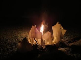 Wir stolpern und drängen uns dichter aneinander. Nun wird nur noch geflüstert und auf den Vordermann geachtet. Zu schnell, als dass wir ihn erkennen können, läuft plötzlich ein „Geist“ in unseren Reihen und verschwindet wieder lautlos im dunklen Wald.