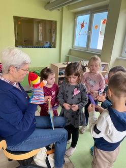 Anderer Ort - gleiche Aktion: In der Kita „Zwergenstübchen“ stand Frau Kamenz mit einer Buchauswahl vor der Tür. Sowohl die Gruppe der Katzen als auch die der Spatzen hatten viel Spaß mit Kasperle, der dem diebischen Teufel mit der gesamten Theatertruppe hinterherjagte, weil der nämlich die Pfannekuchen für Großmutters Geburtstag gestohlen hatte.