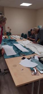Unsere neue Mitstreiterin Petra Wunderlich musste gleich mit ins Bastelteam. Aber das Nähen kommt nicht zu kurz unter Anleitung von Nicole und Gabi wurde zugeschnitten. Auch das muss gelernt werden. Grundlage für jedes Produkt - Modell.