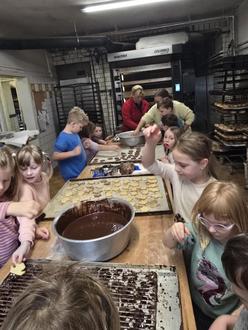 Die fertig gebackenen Schokoladenkekse durften dann von den Kindern noch in flüssige Schokolade getaucht werden. Jedes einzelne Kind war mit so großem Eifer beschäftigt, dass die Zeit viel zu schnell verging, ohne, dass wir es merkten. Zu guter Letzt konnte sich jedes Kind eine Tüte mit unterschiedlichsten Plätzchen füllen, und dann endlich durften auch die übrigen Kekse vernascht werden. Mit einem Dankeschön-Weihnachtslied verabschiedeten wir uns vom Bäcker und seiner fleißigen Helferin Sandy, die uns beim Backen natürlich auch tatkräftig unterstützt hatte.