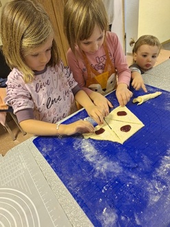 Gleichzeitig duftete es nach leckerem Gebäck. Beim Backen der traditionellen Martinshörnchen haben auch schon die Kleinsten mithilfe der Kuchenfrauen kräftig geknetet, ausgerollt und wundervolle Hörnchen geformt.