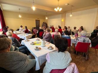 Damit nicht genug. Erstmals hatte unsere Vorleseaktion auch eine ganz andere Zielgruppe im Blick - die Senioren. Dafür hatte sich Frau Leuschner die Kurzgeschichte „Kusine Dorothy“ aus „Sommergeschichten“ von Rosamunde Pilcher ausgesucht. Im Pfarrhaus hatte sich am Nachmittag eine Runde eingefunden, die schon während des Vorlesens, aber noch viel mehr danach, über diese Erzählung redete und diskutierte. Eigene Erlebnisse und Erfahrungen wurden ausgetauscht. Und dabei ließen sie sich die Apfeltaschen, die Frau Leuschner mitgebracht hatte, bei einer guten Tasse Kaffee schmecken.