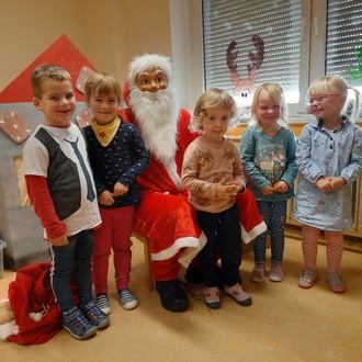 Der Weihnachtsmann erzählte von seinen Rentieren und warum er zu Fuß durch den Wald kam. Dabei hörten die Kinder aufmerksam zu und die große Aufregung war dabei fast vergessen. Nun ging der Weihnachtsmann durch jede Gruppe und brachte uns viele tolle Geschenke. Die Kinder haben sich sehr gefreut und verabschiedeten sich mit einem lauten „Danke, bis zum nächsten Jahr“.