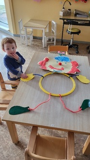 Ein großer Clown begrüßt die Eltern und Kinder im Flur vor dem Katzenzimmer. Gemeinsam bedruckten die Kätzchen mit Korken und Farbe die Haare des Clowns. Ein Hut durfte natürlich nicht fehlen. Dieser lustige Gesell dient nun allen Kindern des Hauses um sich im Ballzielwurf zu üben.