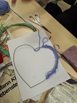 Lina wagte sich an einen herzförmigen Traumfänger und umhäkelte die Form mit Geschick.