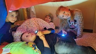 Am nächsten Morgen kamen die Kinder mit Kissen, Decken und Taschenlampen in die Kita und schon konnte es losgehen. Gemeinsam schoben wir Stühle, Tische und kleinere Möbelteile zusammen und holten unseren Stofftunnel dazu.