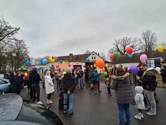 Dann ging es hinaus zur Kita, denn das Schild mit dem Logo sollte ja noch feierlich enthüllt werden. Doch zunächst gab es noch eine Überraschung. Kinder, Eltern und Großeltern konnten auf kleine Zettel schreiben, was sie der Kita „Wiesenwichtel“ alles wünschen. Diese Zettel wurden jetzt an mit Helium gefüllte Luftballons gebunden und mit einem Countdown in den Himmel geschickt.