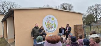 Nun war es soweit: Unter Mitwirkung von Herrn Schrey, Herrn Redlich, Frau Linge-Bielert, Herrn Schade und zwei Kita-Kindern wurde das Schild im Eingangsbereich der Kita feierlich enthüllt.