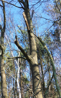 An anderer Stelle wurden Äste abgeschnitten, bei denen durch mangelnde Schnittkenntnis der Ast gebrochen und die Rinde gerissen ist. Oft hängen die abgeschnittenen Äste an der gerissenen Rinde noch im Baum und stellen ein Risiko für die Sicherheit dar.