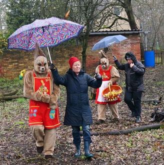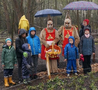 Der Osterhase und seine Helferin kamen wie aus dem Nichts, beschützt durch zwei Regenschirm-Trägerinnen.
