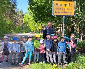 Schon seit einigen Jahren begleitete er uns an einem Tag des Jahres in die Natur, zeigte, erklärte und erzählte spannende Dinge über die heimatliche Tier- und Pflanzenwelt und spielte mit uns tolle Spiele im Freien. Meistens ging es in den vergangenen Jahren zum Biotop am Staupitzer Weidendom. Diesmal schlugen wir den Weg zum nahegelegenen Wald ein.