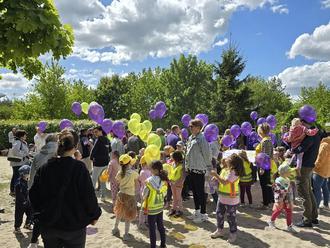 Gegen 11.30 gab es dann noch ein Gruppenfoto und alle ca. 90 Teilnehmenden ließen gemeinsam Luftballons (natürlich in gelb und lila) steigen, an denen ein Flyer zum Thema befestigt war.