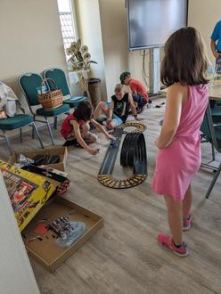 Zwei unserer Bastelkinder bauten die Rennbahn auf, die wir von Familie Throne erhalten haben. In dem Rennbahnset war sogar ein Looping enthalten was für Aktion sorgte.