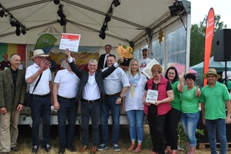 Mit Spannung warteten dann die beiden Bewerber auf die Verkündung, wer denn nun in diesem Jahr den Titel "Naturparkgemeinde 2023" tragen darf. Auch alle anderen Anwesenden sammelten sich vor der Bühne, um den Sieger zu feiern. Landrat Christian Jaschinski, als Vertreter des Kuratoriums, gratulierte Lugau zum Titel. Die Lugauer waren mit einer großen Delegation gekommen und freuten sich riesig.
