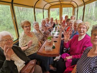 Nach einer Stunde waren wir am Treffpunkt der Bahn und die Heimreise startete - aber nun eine neue Strecke. Carla hatte sich mit dem Fahrer abgesprochen und so schnaufte die Bahn an der Elster entlang Richtung Kahla, Döllingen und dann eine kleine Dorfrunde durch Hohenleipisch. Der neu renovierte Wasserturm über den Reesberg zurück zum Gemeindezentrum. Dort gab es dann einen kleinen Mittagsimbiss. Die Frauen vom Kochkurs bereiteten den Senioren damit noch einmal eine kleine Freude. Nun wurde ausgewertet und viele bedankten sich für die Organisation und die schöne Zeit. Hier wurde doch wieder einmal klar, dass auch in unserem Ort das Wort Vereinsamung schon mal angekommen ist. Die Senioren haben wenig Möglichkeiten sich zu treffen. Wer keine Angehörigen in der Nähe hat. Für jene ganz schlimm. Wir möchten in unserem Gemeindezentrum Senioren aber auch Alleinlebenden die Möglichkeit geben sich bei unseren Angeboten zu treffen, auch einfach mal rauszukommen und wenn's nur zum mal Reden ist. Wir freuen uns auf jeden "Neuen Besucher".
