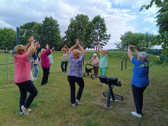 Nun endlich im Wald angekommen. Erste Atemübungen in der freien Natur. Beim ersten Halt am Lobenturm wurdn Hilfestellung beim Abstieg gewährleistet. Nicht so einfach mit Gehbehinderten auf Tour aber Dankbarkeit folgt sofort. Ich mal wieder unter Leute zu sein. Und in so einer geselligen Runde. Bäume erfassen, umarmen und die Atmung nicht vergessen. Leichte Bewegungsübungen bevor es weiter ging. Viele Geschichten um den Loben folgten. Ob es die Sage vom Lobenhirtchen oder die vielen selbst erlebten Geschichten der Heuernte in diesem Gebiet waren. Ein jeder hat so seine Erinnerungen. Über den Floßgraben ging es dann nach Gorden. Ziel dieses Ausflugs der Mehrgenerationen Spielplatz. Aber auch der Toilettengang wurde organisiert. Im DGH Gorden begrüßte uns Frau Karin Gärtner. Danke, dass wir dieses Angebot nutzen durften. Nun ging es endlich auf den Spielplatz. Dort warteten schon die Frauen vom GMZ aus Hohenleipisch. Gesunde Leckereien standen hier bereit. Nach dem Imbiss erklärte Carla die Geräte und einige wagten sich dran, sie auszuprobieren. Toll, dass wir probieren und erleben durften.