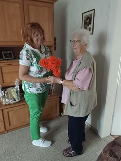 Unsere älteste Besucherin, Frau Thea Mansch beging dieses Fest im Juni. Carla besuchte die rüstige Seniorin und beglückwünschte sie zu ihrem Jubiläum. Mit selbst gebastelten Mohnblumen, die kein Wasser brauchen (ganz witzig).