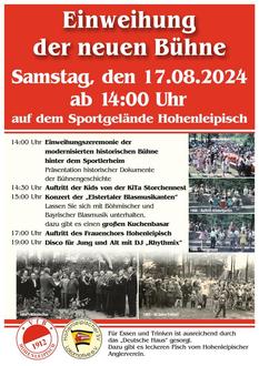 Der Hohenleipischer SV Lok und der VfB Hohenleipisch 1912 haben gemeinsam mit Unterstützung der Gemeinde und dem Amt Plessa das Areal hinter dem Sportlerheim und die traditionsreiche Bühne modernisiert. Am Sonnabend, den 17.08.2024 findet die Einweihungsfeier statt. Eingeladen sind alle Hohenleipischer zu einem bunten Bühnenprogramm ab 14.00 Uhr.