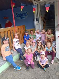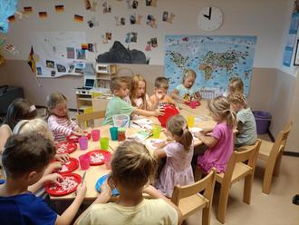 Diese ließen wir uns unter dem Pavillon schmecken. Danach kamen viele tolle Spiele und Wettbewerbe, die sich alle um das Thema Länder drehten. Auch in einer in einer großen Rätselrunde mit unserem Reisekoffer, bemerkten wir schnell, wieviel wir in den letzten Wochen gelernt haben. Bei viel lustiger Musik, stießen wir mit unserem selbstgemachten Bubble Tea an. Jetzt hieß es Taschenlampen an und auf zur Nachtwanderung. Am Feldweg und Waldrand haben wir einige Spuren entdeckt und manch einem wurde es ein bisschen gruselig. Aber gemeinsam sind wir stark und fest an der Hand des besten Freundes, haben wir auch das gemeistert. Am Kindergarten angekommen, waren wir alle richtig geschafft und müde. Nun hieß es noch: eine Katzenwäsche und dann in den Kuschelbereich. Mit unseren Taschenlampen haben wir noch tolle Schattenspiele gemacht, sodass bei der Gute-Nacht-Geschichte schon manches Auge zuging. Am nächsten Morgen hieß es erstmal „Raus zum Frühsport“. Nun waren wir fit für den Tag und genossen unser gemeinsames Frühstück.