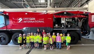 Als das Flugzeug startklar war, rollte es zur Startbahn und wir fuhren mit dem Bus parallel zur Startbahn, sodass wir genau den Startvorgang beobachten konnten. Danach schauten wir uns noch die Flughafenfeuerwehr an und waren beeindruckt von der Größe der Fahrzeuge und ihrer speziellen Ausstattung.
