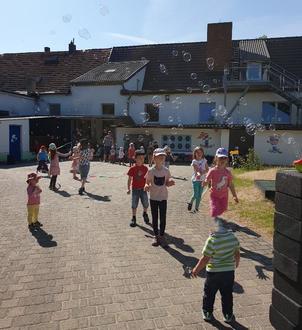 Zum freien Tanzen gab es Gymnastikbänder und bei schönstem Wetter durften auch die Seifenblasen für Groß und Klein nicht fehlen. Ein weiterer Höhepunkt waren die Staffelspiele mit Eierlaufen und Sackhüpfen, bei denen es kleine Naschereien für alle Teilnehmer gab.