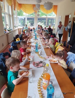 Es gab für alle Nudeln mit Tomatensoße oder Nuggets und Pommes, als Nachtisch gab es noch eine Kugel Eis, die sich alle Kinder haben schmecken lassen, bevor es mit dem Bus wieder in die Kita ging. Es war ein gelungener Ausflug für alle und wir bedanken uns für die Unterstützung der Eltern an diesem tollen Tag.
