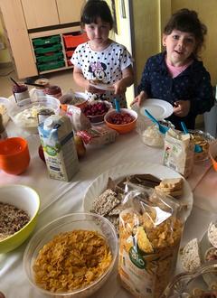 Eine bunt gemischte Auswahl an Obst, Brötchen und Schnitten, Käse und Wurst sowie Cornflakes, Müsli und Joghurt, wird den Kindern geboten. In einer regelmäßigen Wochenfolge wechseln sich die Nahrungsmittel ab.