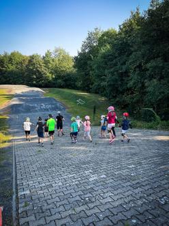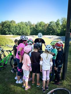 Bei strahlendem Sonnenschein besuchten fast 20 Kinder mit Hortnerin Jana Materne den großen Abenteuerspielplatz für Zweiräder auf der Von-Delius-Straße. Vereinsvorsitzende Steffi Marth erklärte den wissbegierigen Grundschülern den Unterschied zwischen BMX und Mountainbike und zeigte den Kids zunächst die Strecke zu Fuß.