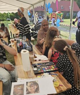 „Komm, ich zeige dir was Tolles aus meiner Heimat!“ Ganz getreu diesem Motto, fand am 19. Juli 2024 das Sommerfest in der Gemeinschaftsunterkunft Hohenleipisch statt. Als die Planungsphase anfing, war noch nicht klar welche Aktion, Thema oder Motto unsere Veranstaltung anbieten soll, damit die interkulturelle Öffnung und der Austausch aller Bewohnenden und Gäste gefördert wird. Als ich eines Tages abends wegen einer Havarie in die Unterkunft kam, war ich überwältigt: die Frauen saßen draußen und haben sich ausgefallene Zöpfe geflochten, Musik gehört, getanzt, gelacht. Eine weitere Gruppe junger Frauen waren ruhiger und konzentrierter, dort wurden Hände und Arme mit den Hennabildern verziert. Die Männer spielten mir unbekannte Kartenspiele. Und so ist die Idee für unser Fest entstanden: Hobby, Freizeit in anderen Ländern. Die meisten unserer Bewohnenden sind ziemlich gut organisiert und bemühen, sich zu integrieren: besuchen verschiedene Deutschkurse, absolvieren berufliche Qualifizierungsmaßnahmen, gehen einer Arbeit nach. Doch wie gestalten sie ihre Freizeit, welche Hobbys üben sie aus, wissen sie was typisch für Deutschland ist?