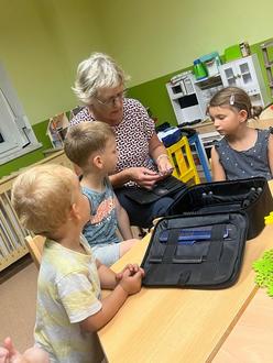 Frau Degen hatte eine große Tasche mit allerlei Utensilien mitgebracht. Mit großer Geduld erklärte sie die Aufgaben eines Friseurs und was er so alles braucht.
