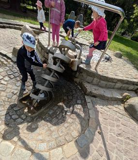 Das Beste aber war der Wasserspielplatz, bei dem die Kinder mit ordentlichem Körpereinsatz das Wasser in Bewegung bringen konnten. Mit Kippbewegungen setzten sie eine Wasserpumpe in Gang, welche das Wasser zu einer Kurbel beförderte.