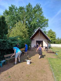 Willkommenskultur am Dorfeingang - nicht nur die Sitzgelegenheiten am Friedhof erstrahlen nun in frischem Glanz, auch die Willkommenschilder am Dorfeingang wurden liebevoll neugestaltet. Mit Pinsel, Farbe und guter Laune setzten die Teilnehmenden ein Zeichen für Zusammenhalt und ein lebenswertes Dorf. Auch im Park wurde an den Wegen gearbeitet.