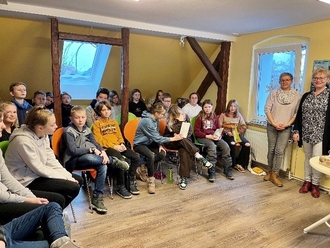 Die besten LeserInnen der Klassenstufe 6 wurden durch einen klasseninternen Vorentscheid ermittelt und drei Schülerinnen nominierten sich für den Vorlesewettbewerb am 1. Dezember. Sehr gut vorbereitet stellten sie nacheinander ihr Lieblingsbuch vor und sorgten mit einer interessanten Textpassage für Neugierde auf dieses Buch. Um die jeweilige Leseleistung realistischer einschätzen zu können, lasen die Mädchen im zweiten Durchgang einen unbekannten Text vor – die dreiköpfige Jury bewertete jede Leserin nach verschiedenen Kriterien. Sehr stolz auf alle drei Leseratten wertete Frau Lode die Leseleistung einzeln aus, überreichte kleine Preise und durfte neben Klassenleiterin Grit Steude der Siegerin Viktoria Bruntsch herzlich gratulieren. Viktoria wird die Grundschule Prösen auf Landkreisebene vertreten.