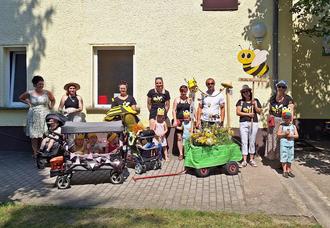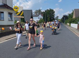 Gut ausgerüstet mit einer Hummelwiese im Bollerwagen sind die „Hummeln“ der Kita mit dem Festzug bei viel Sonnenschein und molliger Temperatur durch Haida gezogen.