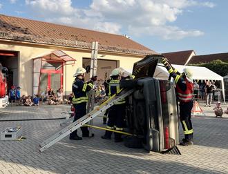 Neben leckerem Kuchen, Zuckerwatte und Gegrilltem, gab es auch viel über die Feuerwehr zu entdecken. Am Rauchhaus wurde präsentiert warum Rauchmelder so wichtig sind und Leben retten können. Weiterhin gab es eine Einsatzübung mit dem Stichwort „Technische Hilfe – Verkehrsunfall mit verletzter Person“. Das verunfallte Auto lag auf der Seite und wurde von unseren Kameraden gesichert und die Person durch eine schnelle Rettung aus dem Fahrzeug befreit.