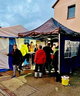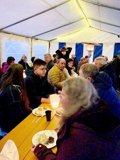 Am 04.10. ab 17.00 Uhr fanden sich nach und nach 74 Erwachsene und 11 Kinder zu einem gemütlichen Beisammensein ein. Trotz regnerischen Wetters herrschte im Zelt eine ausgelassene Stimmung. Generationenübergreifend war von der ersten Minute an nicht zu spüren, wer alteingesessener oder neu zugezogener Bewohner war. Nette Gespräche trugen dazu bei, das Motto des Abends mit Leben zu erfüllen. Reichlich Essen und Trinken waren vorhanden, liebevoll von den Bewohnern zubereitet und organisiert.
