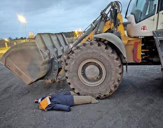Simuliert wurde ein Unfall mit einem Radlader und einem Fußgänger. Der Fahrer des Fahrzeuges lag ohnmächtig in der Fahrerkabine und der Fußgänger war mit einem Fuß unter dem Rad des Radladers eingeklemmt.